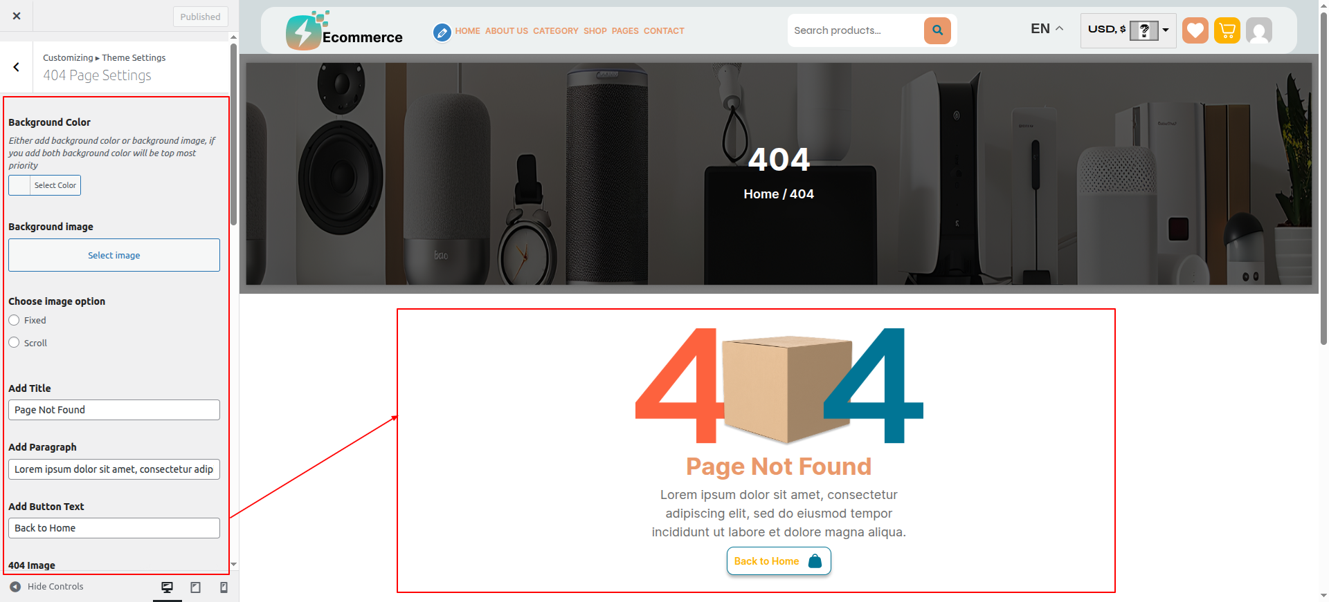 Go to Appearance >> Customize >> Theme Settings >> 404 Page Settings