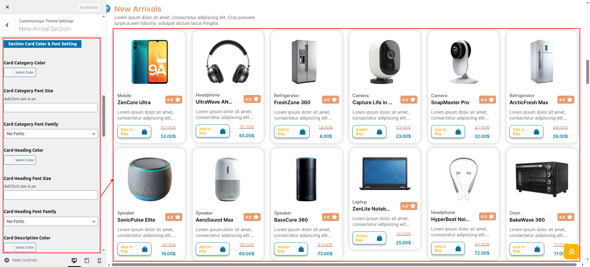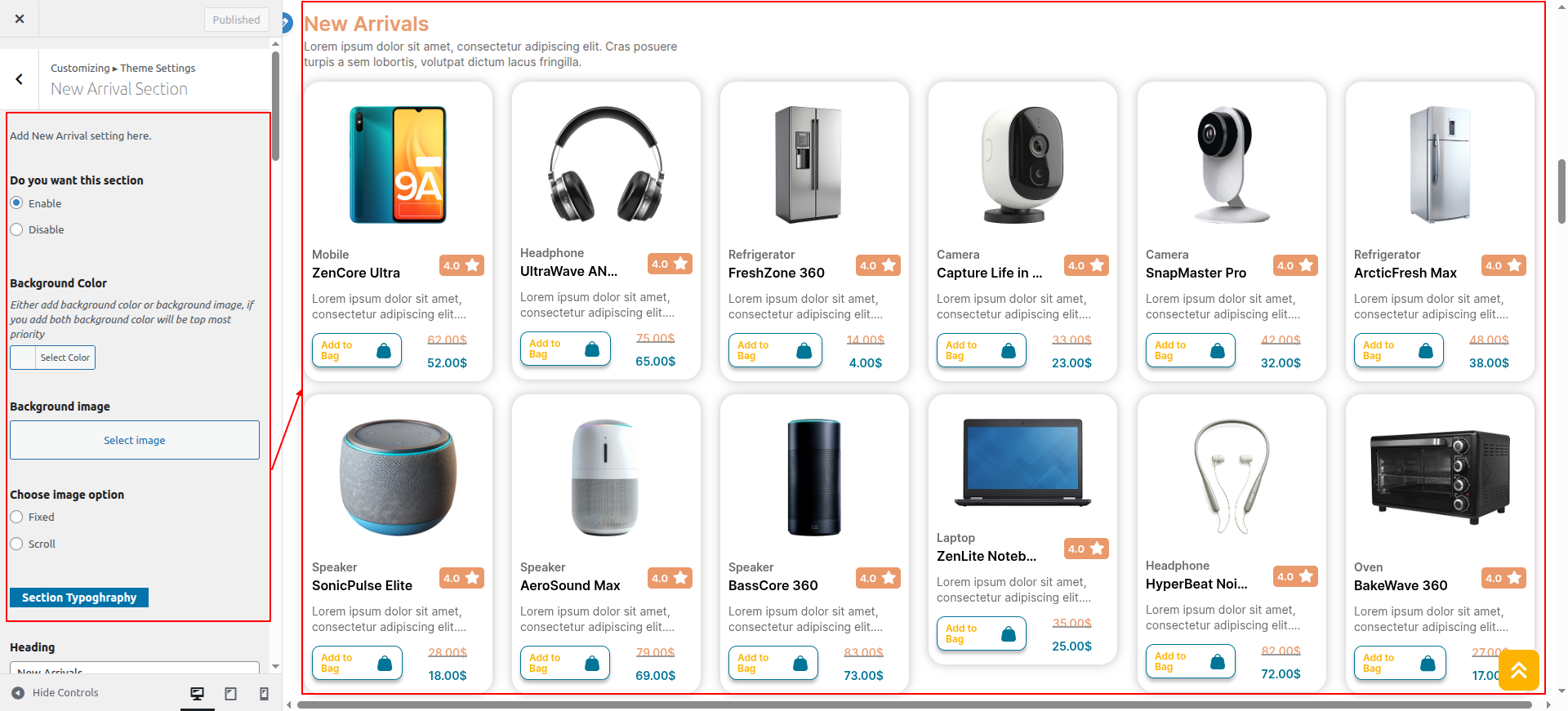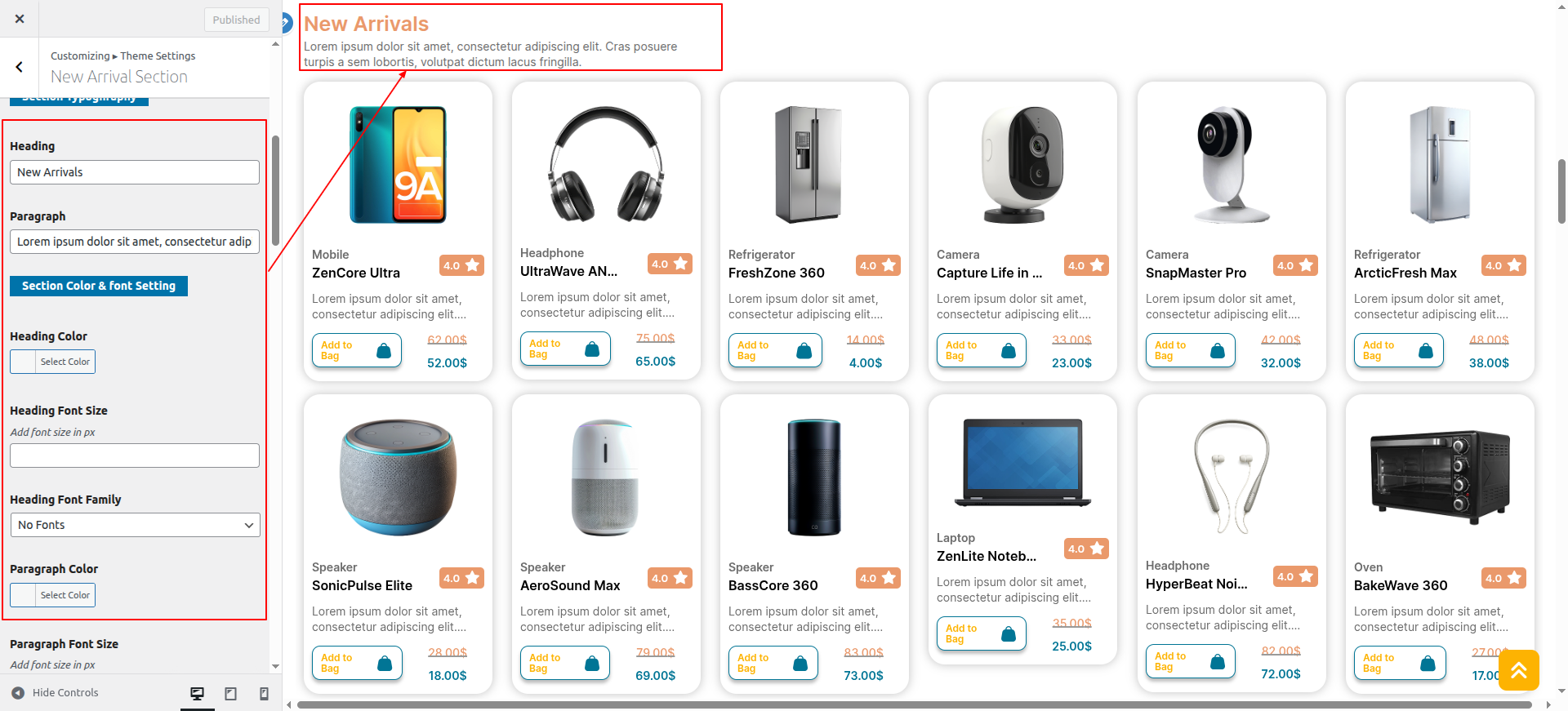 Go to Appearance >> Customize >> Theme Settings >> New Arrival Section