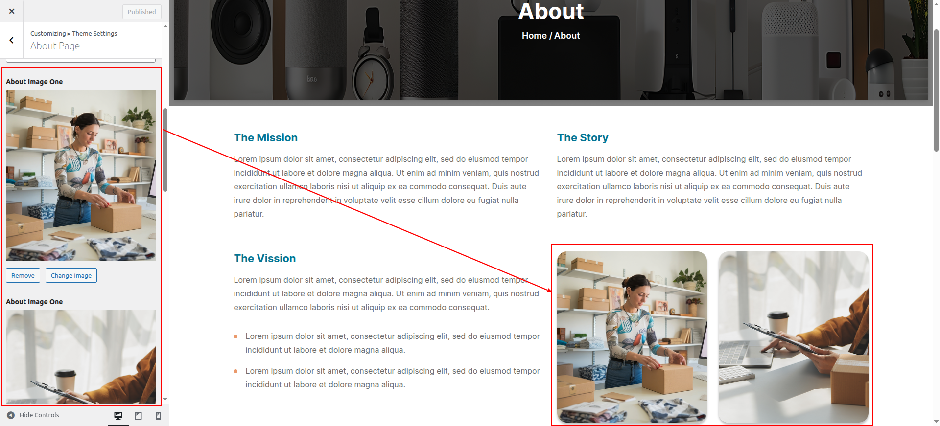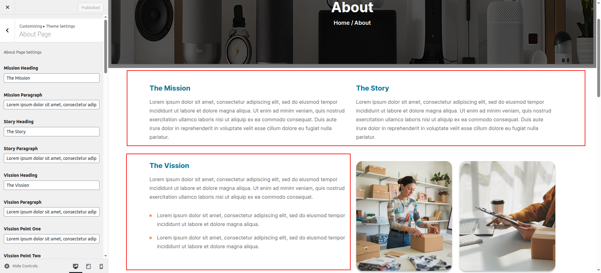 Go to Appearance >> Customize >> Theme Settings >> About Page