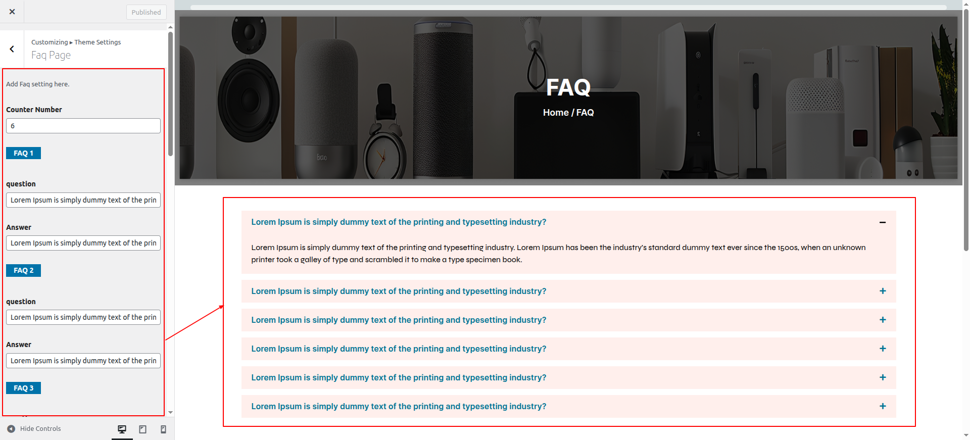 Go to Appearance >> Customize >> Theme Settings >> Faq Page