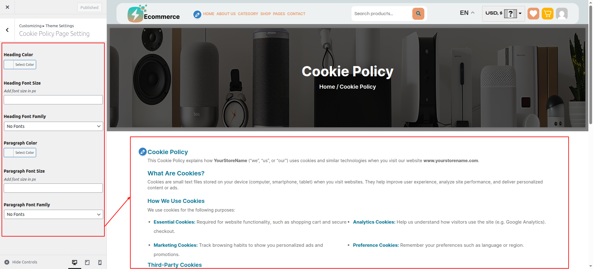 Go to Appearance >> Customize >> Theme Settings >> Cookie Policy Page Settings