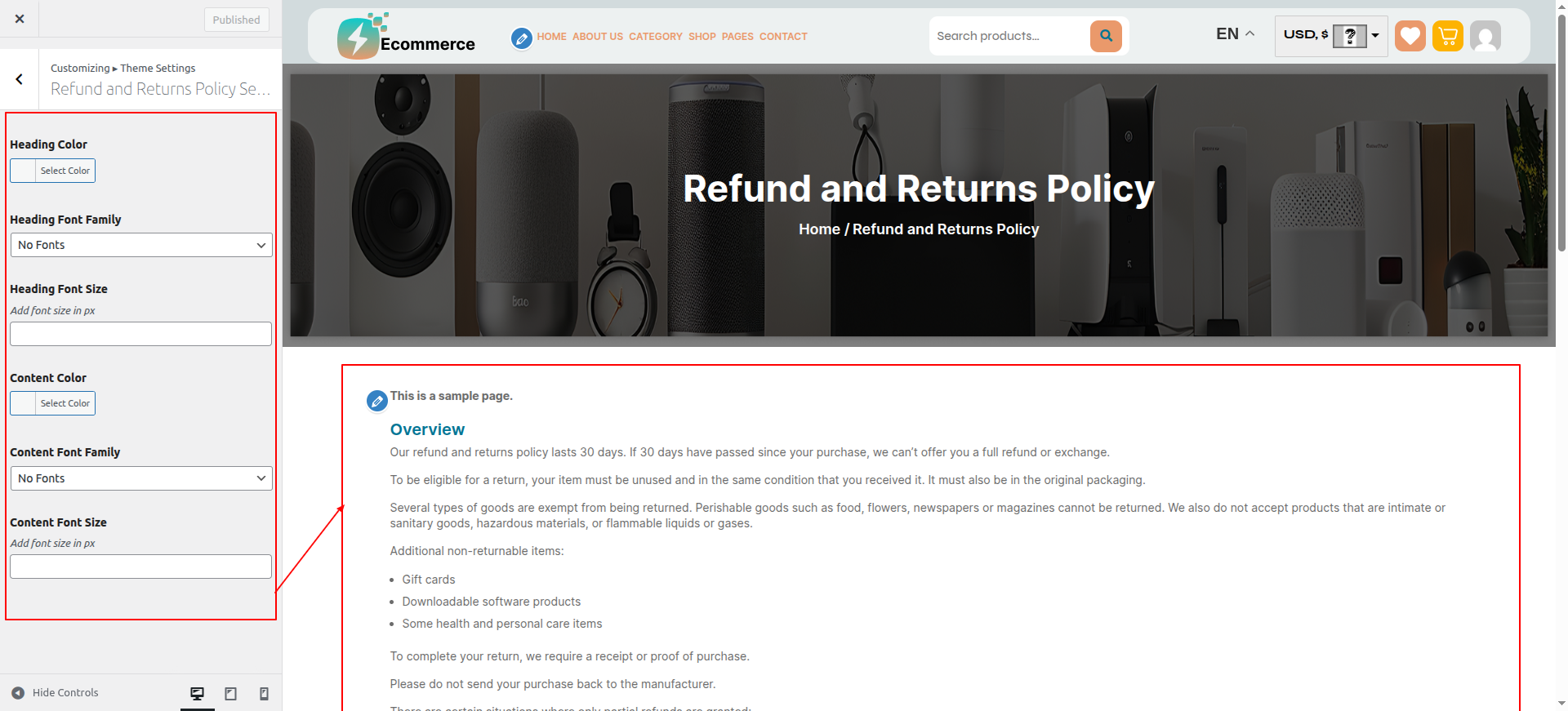 Go to Appearance >> Customize >> Theme Settings >>Refund and Returns Page Settings