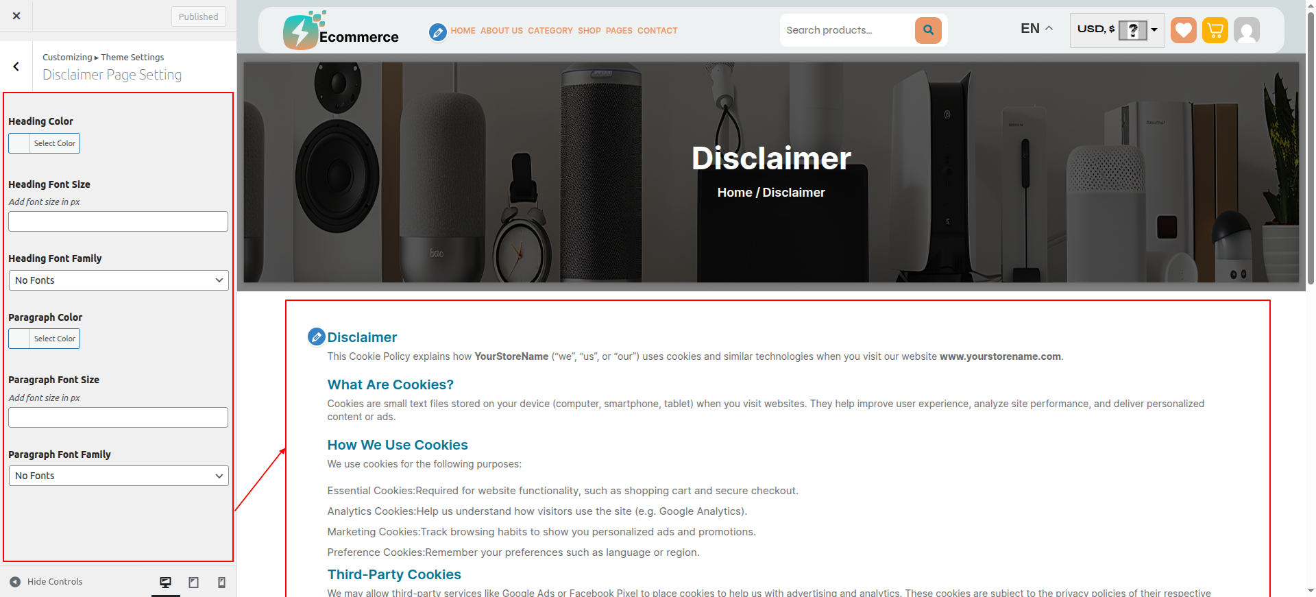Go to Appearance >> Customize >> Theme Settings >> Disclaimer Page Settings