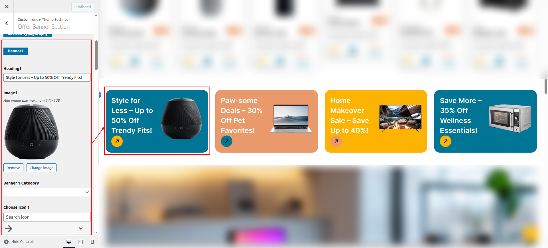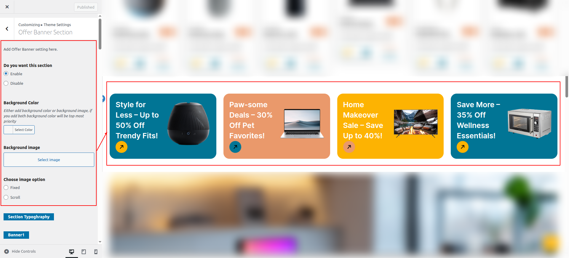Go to Appearance >> Customize >> Theme Settings >> Offer Banner Section