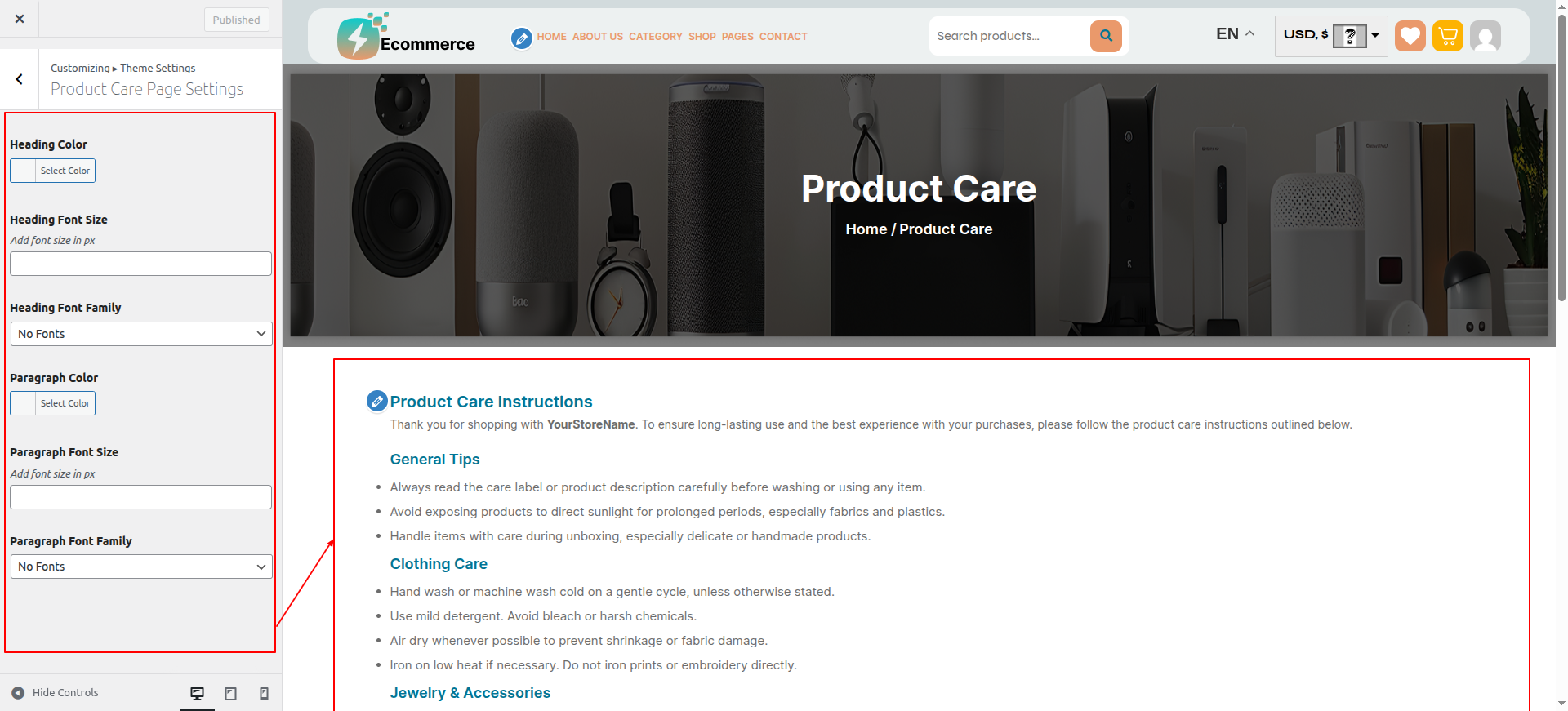 Go to Appearance >> Customize >> Theme Settings >> Product Care Page Settings