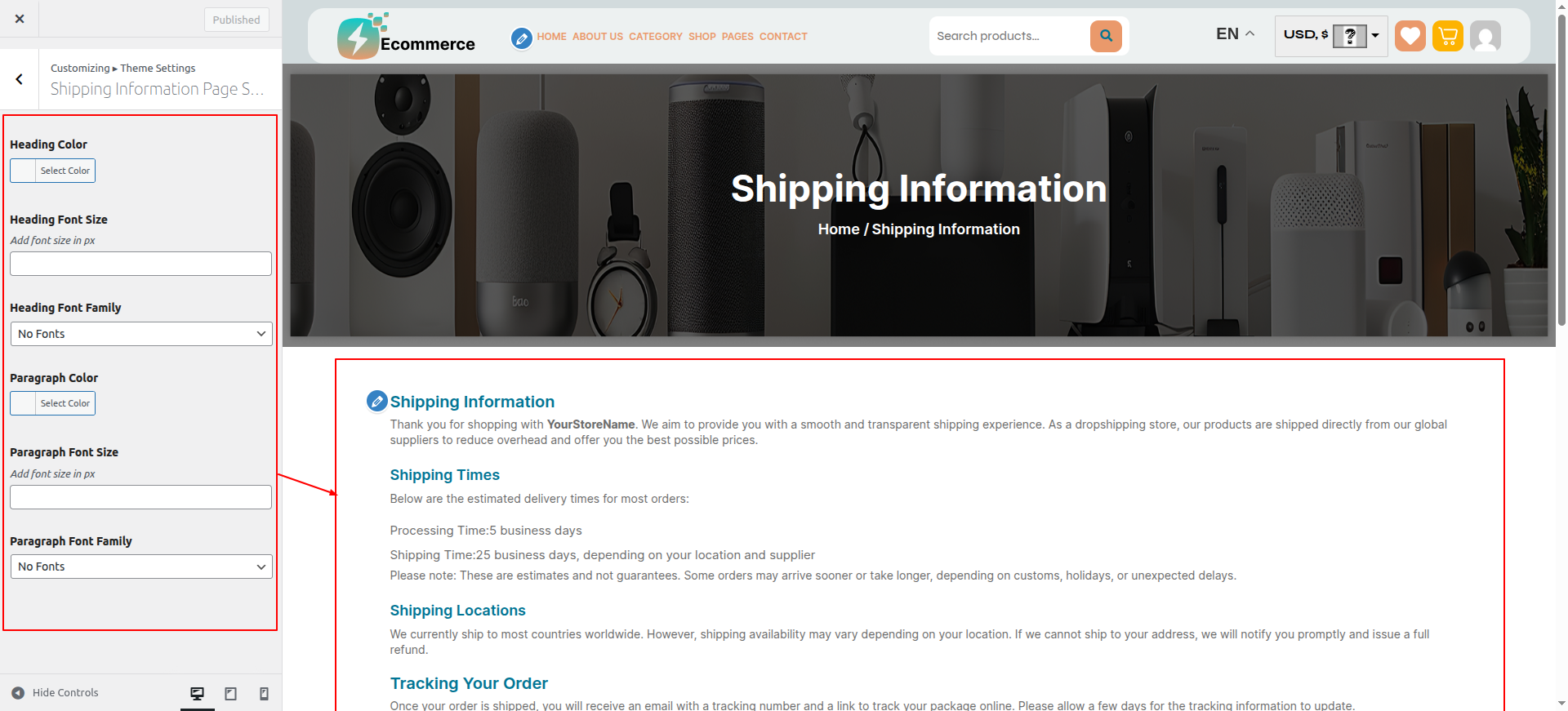 Go to Appearance >> Customize >> Theme Settings >> Shipping Information Page Settings