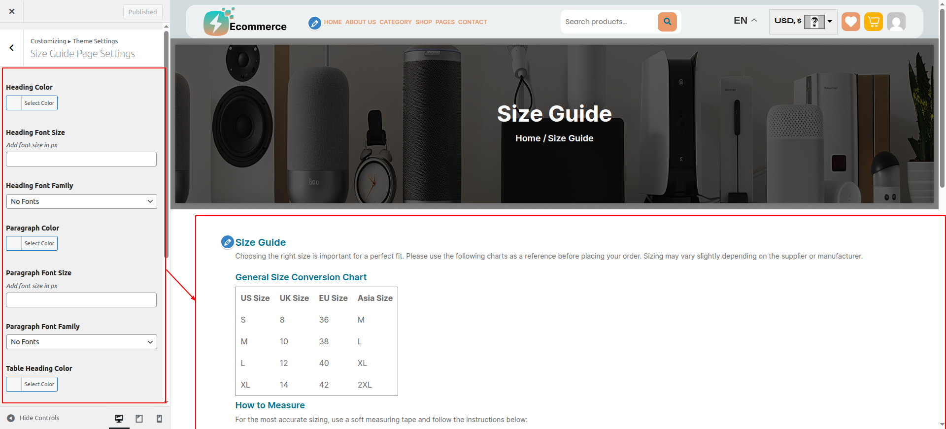Go to Appearance >> Customize >> Theme Settings >> Size Guide Page Settings