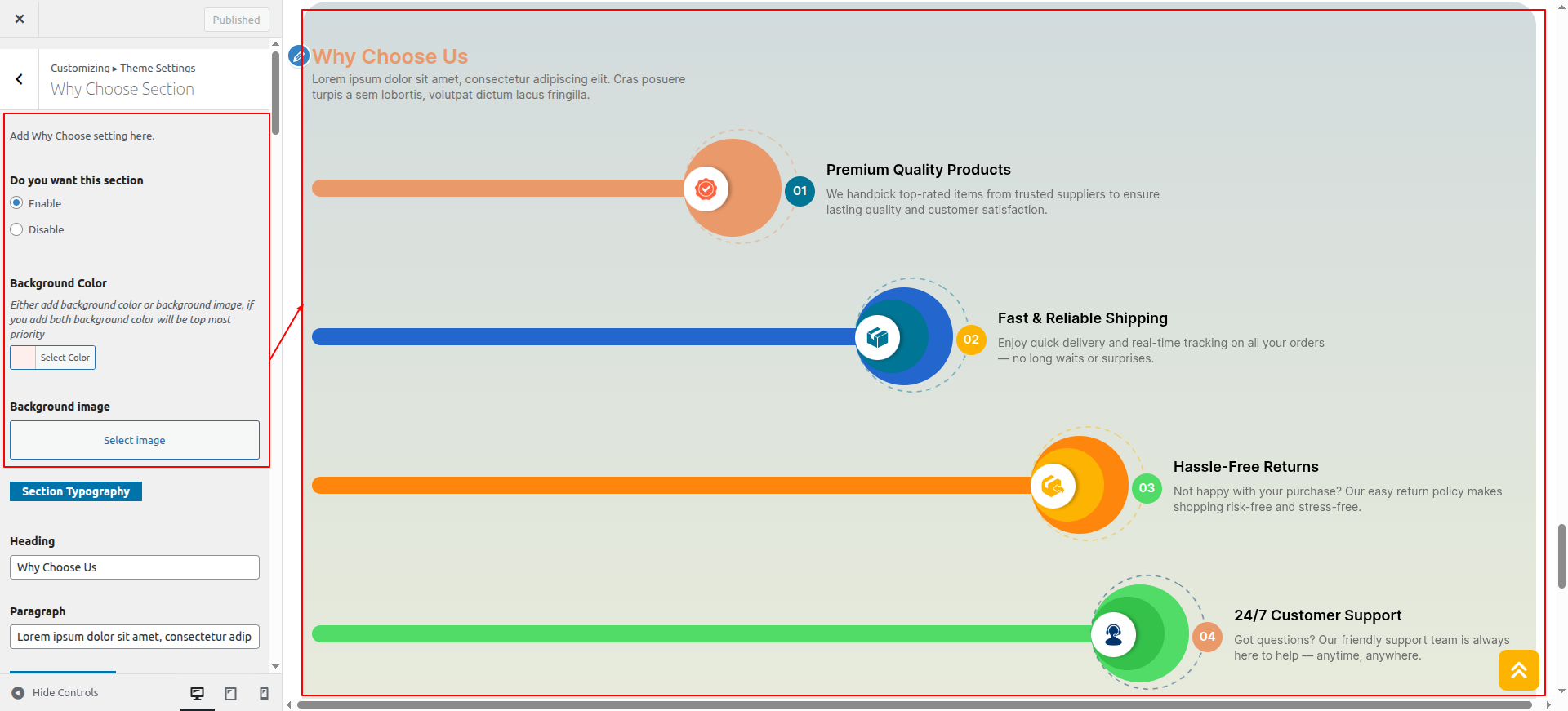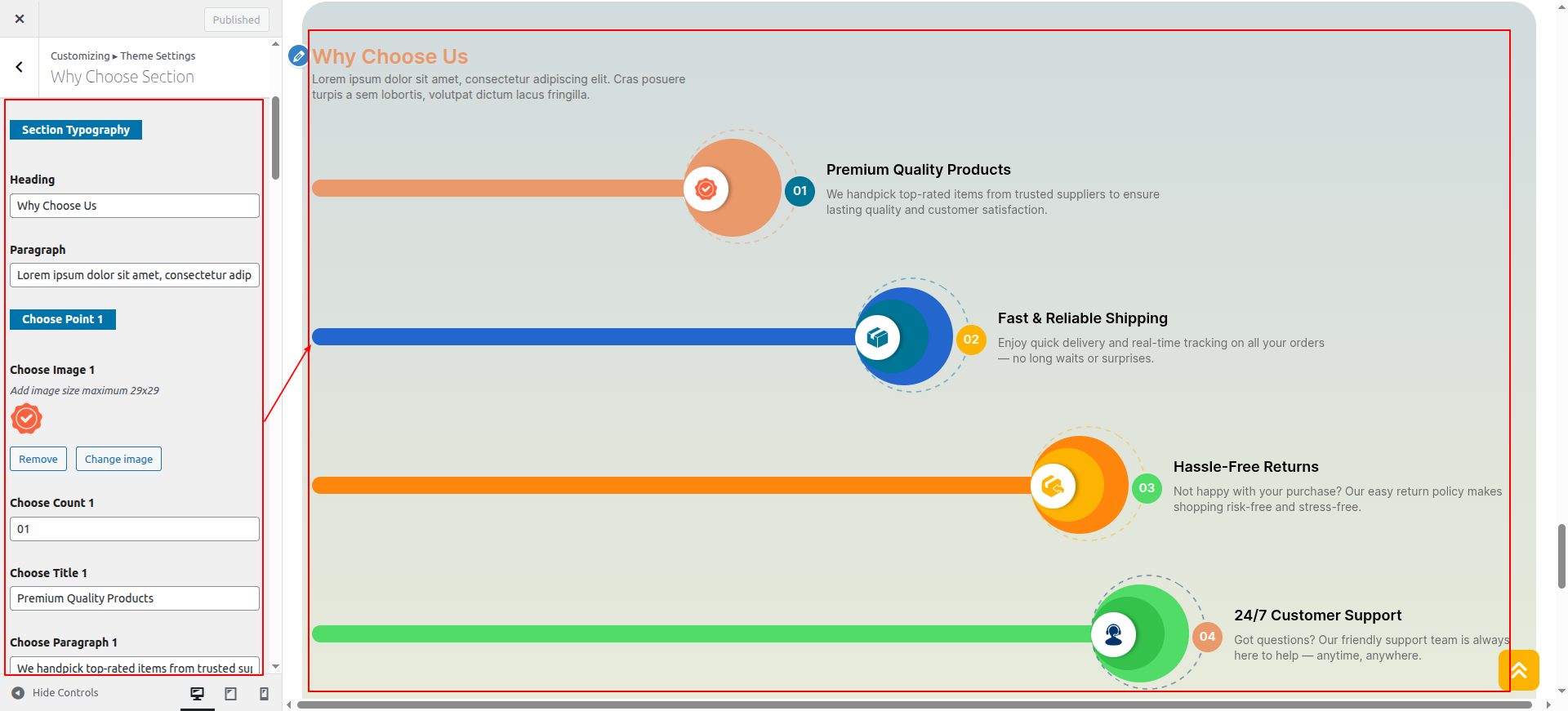 Go to Appearance >> Customize >> Theme Settings >> Why Choose Section